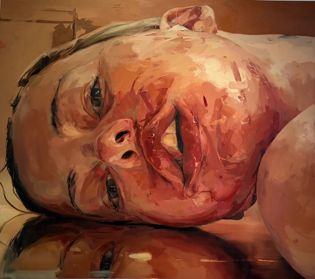 In the portrait rooms, it is always the same face looking back at us: large manga eyes, soft lips — but that beautiful face is brutalised by the paint. Reds and blues bring out swollen lips, bruises on the cheekbones, contusions on the skin. The eyes, reddened by tears, are always slightly wide and uncertain, as though they cannot understand the violence that has struck them.